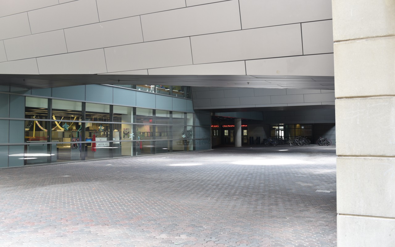 Patio between Langsam Library, Rhodes Hall and Zimmer Hall
