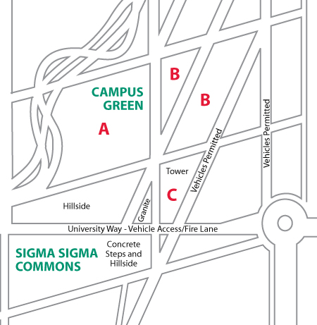 The map identifies outdoor spaces that require a reservation for an event. Note the Bearcats Commons and Campus Green are divided into sections because the spaces are large enough to share and host multiple events, depending on activity and crowd size. If you need the entire space for your event, remember to reserve all sections in 25Live. To clarify misconceptions, Sigma Sigma Commons refers to the outdoor amphitheater space south of the service drive.