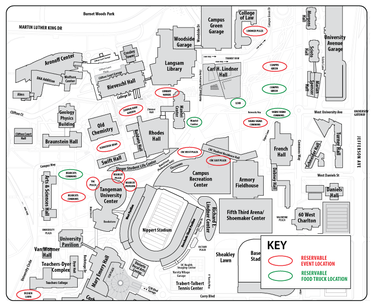 The map identifies outdoor spaces that require a reservation for an event. Note the Bearcats Commons and Campus Green are divided into sections because the spaces are large enough to share and host multiple events, depending on activity and crowd size. If you need the entire space for your event, remember to reserve all sections in 25Live. To clarify misconceptions, Sigma Sigma Commons refers to the outdoor amphitheater space south of the service drive.