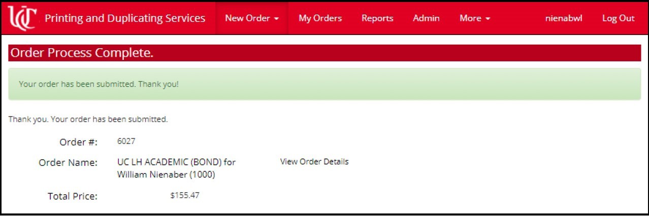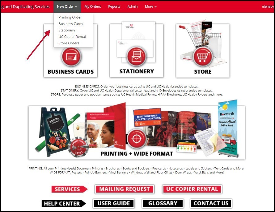 - You can select the appropriate option from the New Order menu in the red header bar. Note that Printing and Wide Format categories are grouped together under the Printing Order option, as shown on the corresponding button. The UC Copier Rental option will take you to the form to submit a request for a departmental copier/printer.