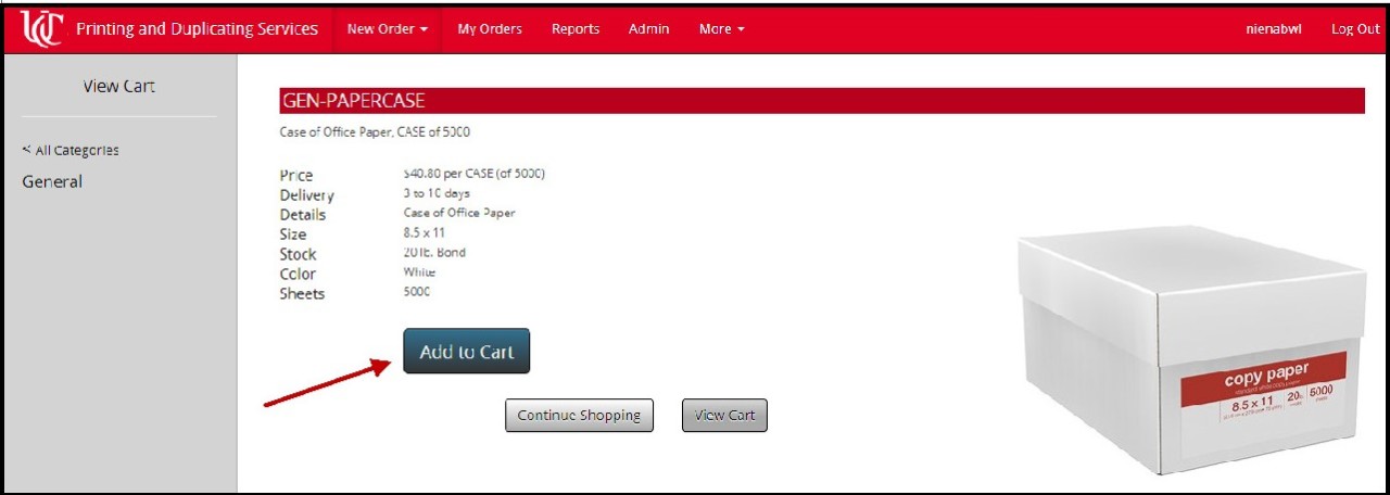 The General section of the Store features paper, which is available by the ream or by the case, and blank envelopes. Let’s say you need a case of paper for your departmental copier or printer. Click the icon representing a case of plain white office paper. That’s 10 reams total.