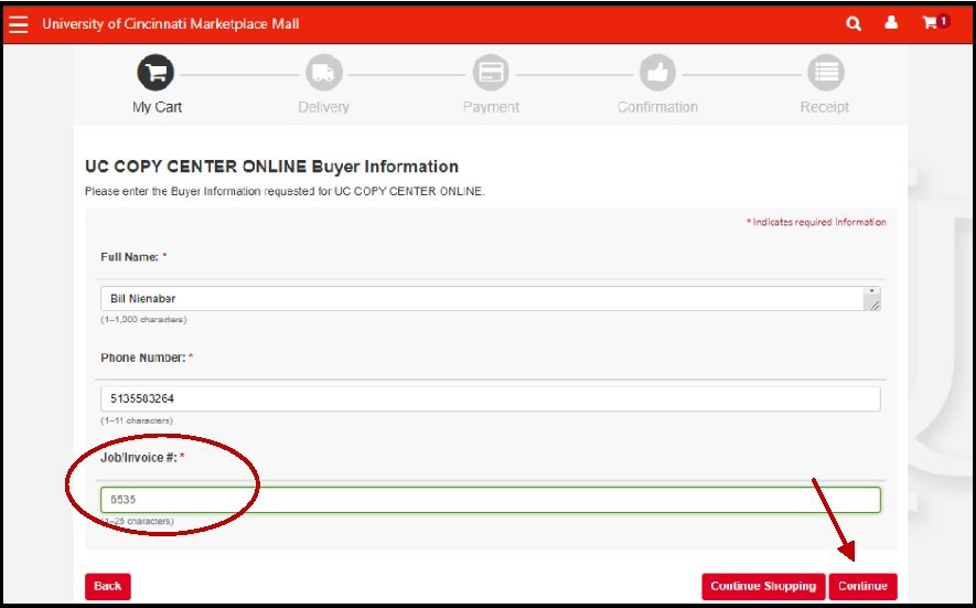 Next, enter the required information (all 3 fields are required). In the bottom field (Job/Invoice #:), please enter the order number found on the order you’re paying for. Then click Continue.