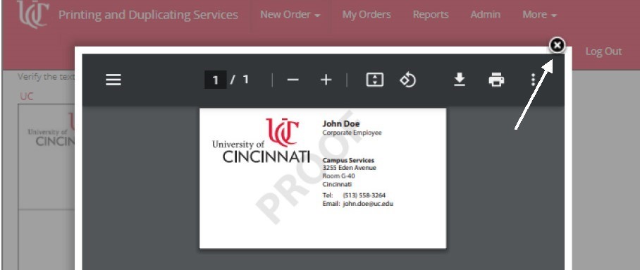 A pop-up window will open showing you a proof of the card information you’ve entered. If all is well, click the X at the upper right of the window.
