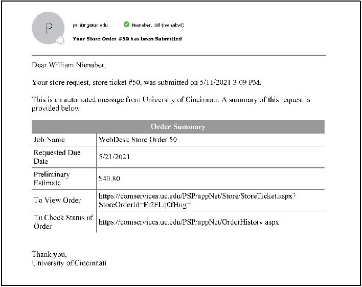 You will receive a confirmation that your order has been submitted, with a ticket number for your reference.