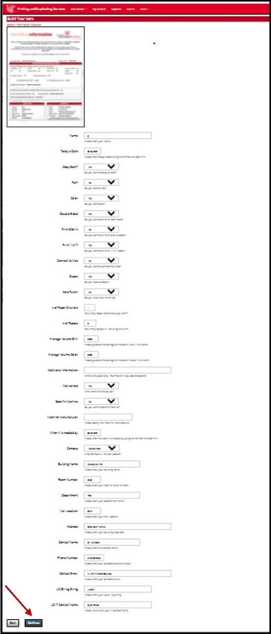 All fields are required, (with the exception of Additional Information, Machine Manufacturer, and UC IT Contact Name) so make sure you fill the form in completely. If you have questions, contact a member of our team for help. If you are interested in a specific manufacturer, there is a field where you can enter the name. When you have completed the form, click Continue.