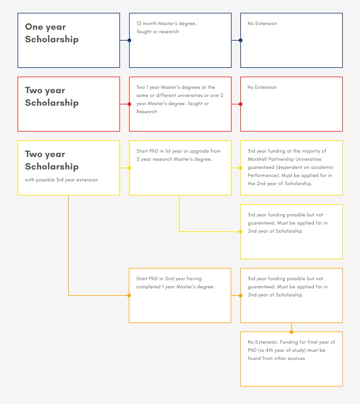 A Marshall Scholarship fully funds 1-2 years of graduate study at any institution of higher education in the United Kingdom. Funding covers tuition & fees, cost of living, a book allowance, research and travel grants, and the cost of travel between the US and the UK. There are several different ways to use the scholarship as explained by this routemap. With a few exceptions, any degree program at any institution of higher education can be funded by a Marshall Scholarship.
