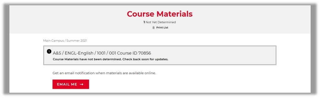 On the course schedule, if the materials are not yet available for order, student may click the "Email Me" button be notified when the materials information is added.