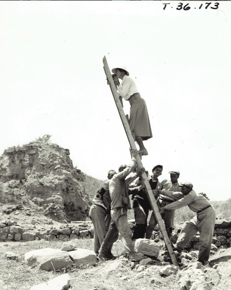 UC Classics archaeologist Marion Rawson stands on a ladder to get a better perspective while taking video of excavations at Troy with UC archaeologist Carl Blegen. Photo/UC Classics