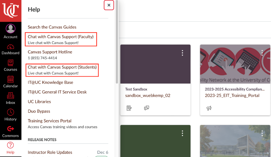 • Start a chat support session in Canvas: Click the “Help” icon in the left-hand navigation menu and select “Chat With Canvas Support.”
