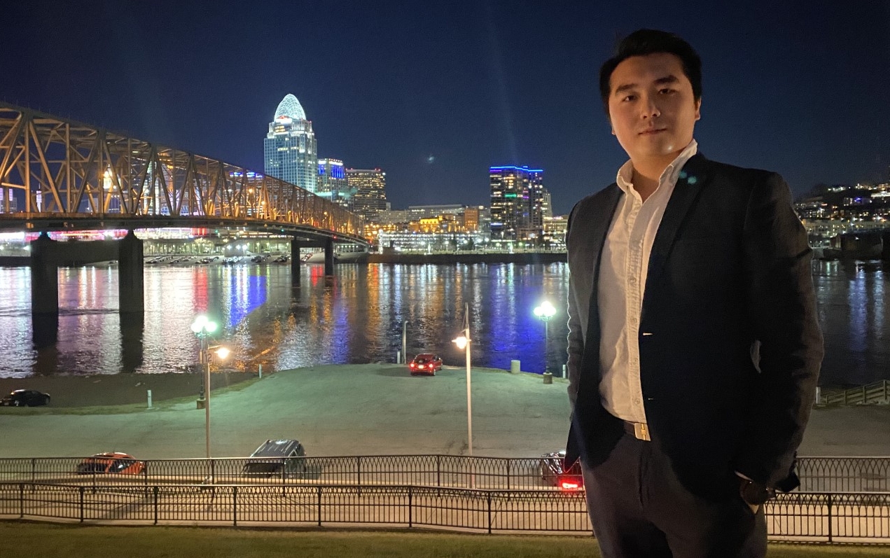 Mark Woo dressed in a suit poses for a photo in front of the Cincinnati skyline at night.