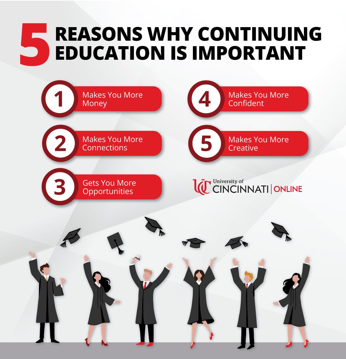 While continuing your education offers a lot of benefits, the most notable benefits include increased salary, a broader network, more job opportunities, elevated professional confidence, and improved creativity.
