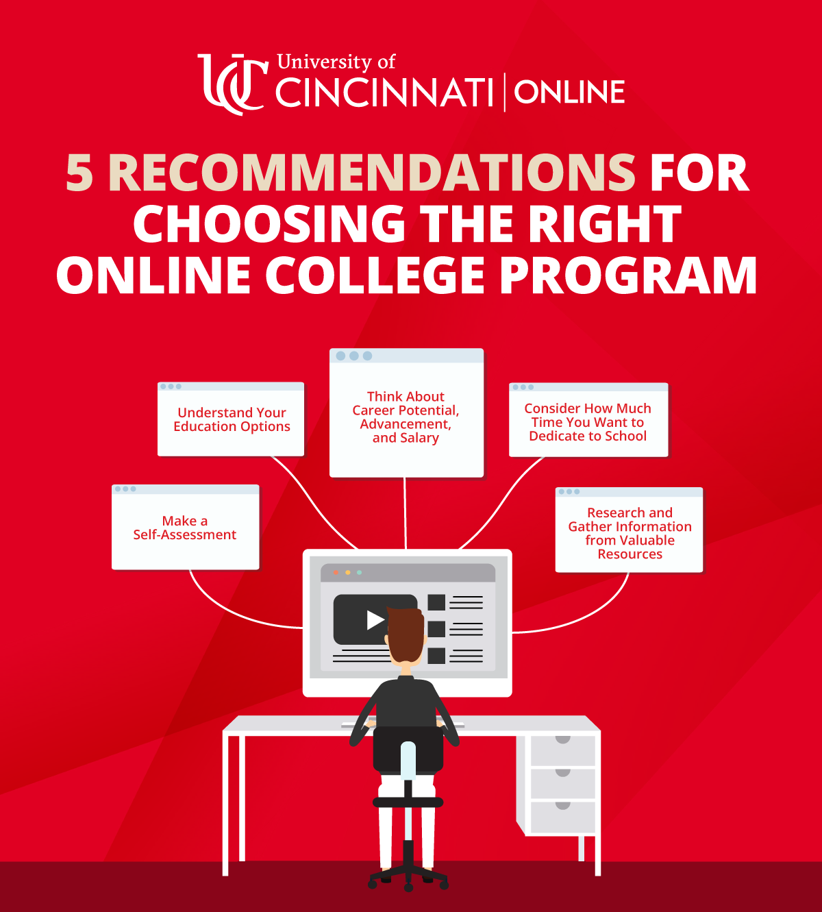 Whether you’re a traditional student entering college for the first time, looking to further your career with additional education, or changing careers, choosing the right program can be challenging. At UC Online, we’re here to help guide you through your educational journey and provide support from application to graduation. With over 130 online programs—including certificates, associate, bachelor’s, master’s, and even doctoral degrees—the University of Cincinnati has something for everyone. Not sure what program is right for you—or even where to begin? You’re not alone. Many of our students started their journey the same way. Read our five helpful tips below for insights that may help you narrow your choices.