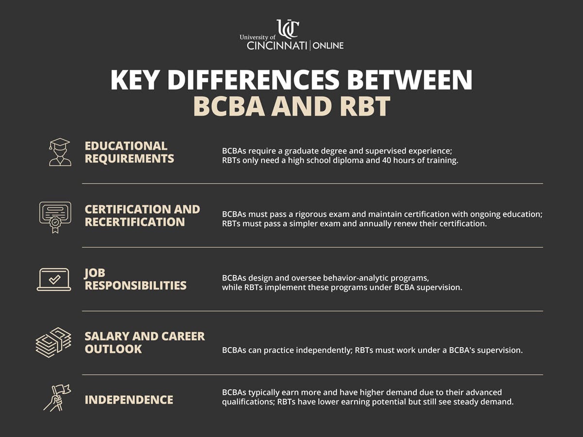 - Education & Certification Requirements: BCBAs must earn a graduate degree and complete supervised experience, while RBTs need only a high school diploma, 40 hours of training, and certification to begin working in the field.
