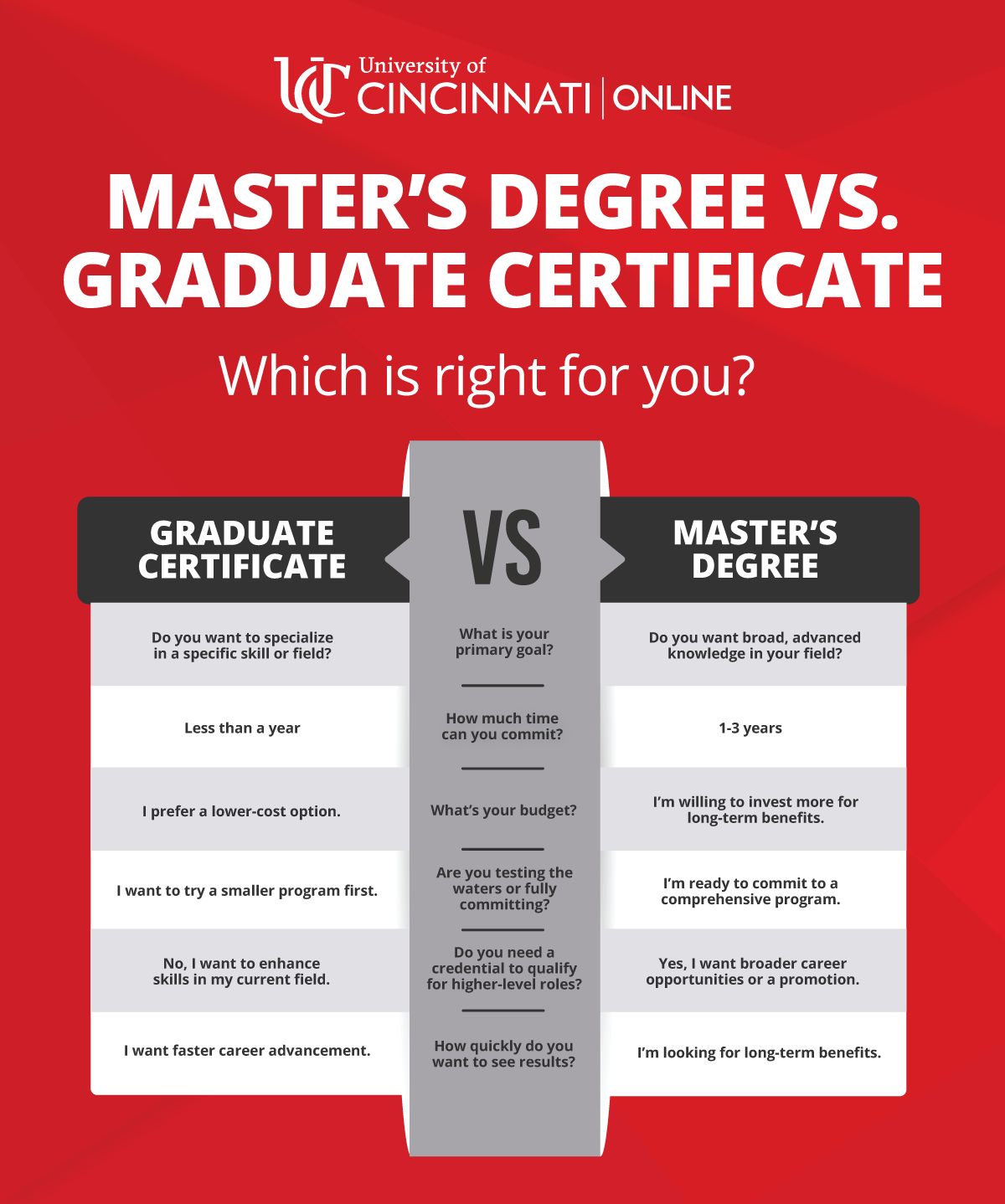 When it comes to your education and deciding between a master’s degree or graduate certificate, there isn’t a right or wrong choice. This is particularly true when you enroll in a reputable, recognizable, and fully-accredited university, such as the University of Cincinnati. Both credentials identify you as a lifelong learner and demonstrate your enhanced knowledge—and skills—in your field. These are highly-praised characteristics that employers cherish and reward. So as for your education journey, the choice depends on what skills you want to gain, the goals you have for your career, and the commitment you can make for your postgraduate program.