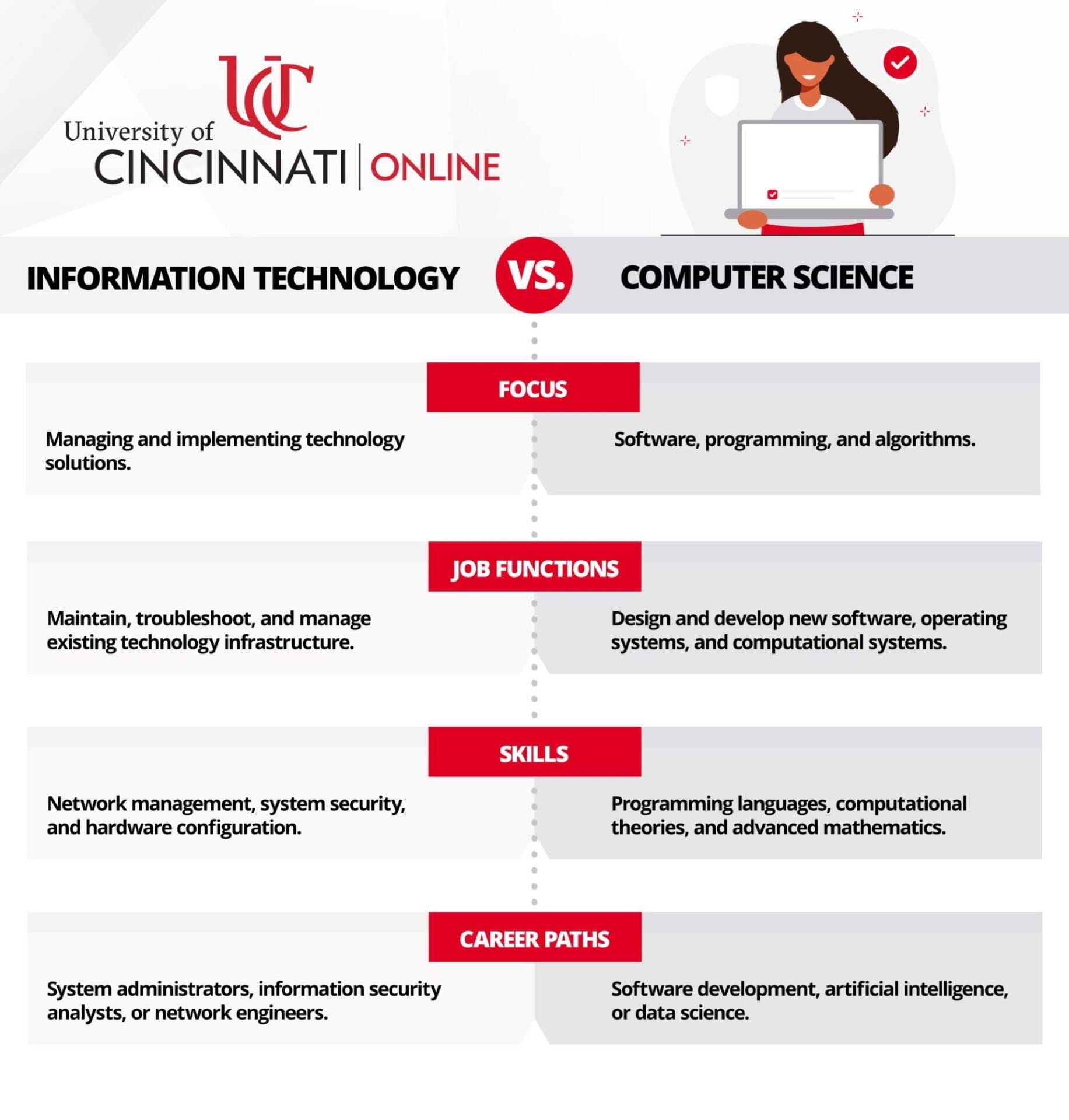 Whether you’re interested in a career in IT or computer science, the University of Cincinnati’s online Master of Science in Information Technology can help you reach your goals. Our program is designed to provide both foundational knowledge and practical experience, with courses covering areas like cybersecurity, software development, and cloud computing. You’ll gain the skills needed to advance in your career while learning from industry experts in a flexible, fully online format. Reach out to an enrollment advisor today for personalized help and support to kickstart your IT or CS career.