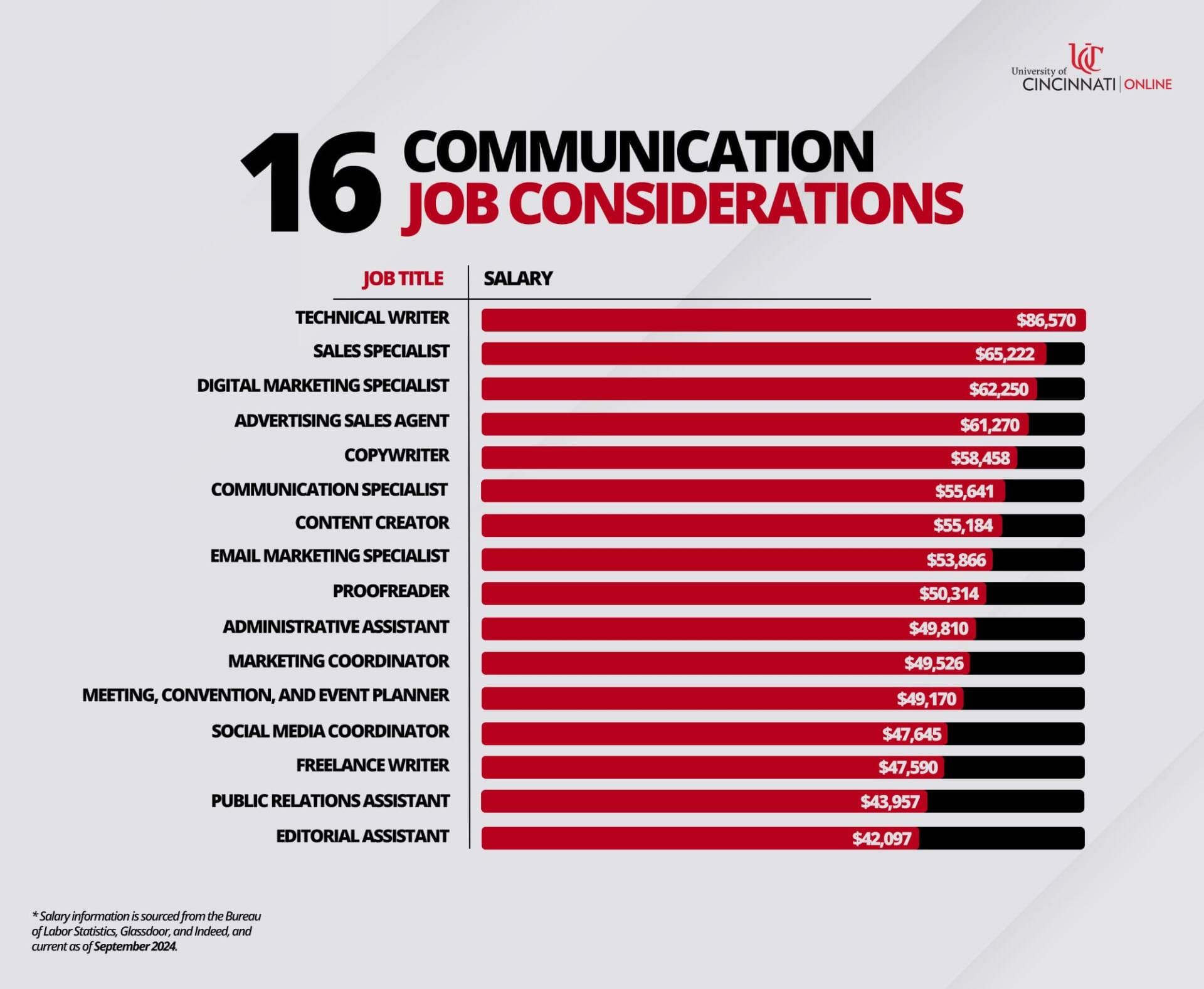 Job Description: Communications Specialists create content, manage media inquiries, and ensure the consistency of internal and external messaging. National Average Salary: $55,641 per year Job-Seeking Tips: Gain hands-on experience through internships or volunteer work. Highlight your writing skills and ability to manage social media platforms when applying. Developing a portfolio with writing samples or communication plans can help you stand out.