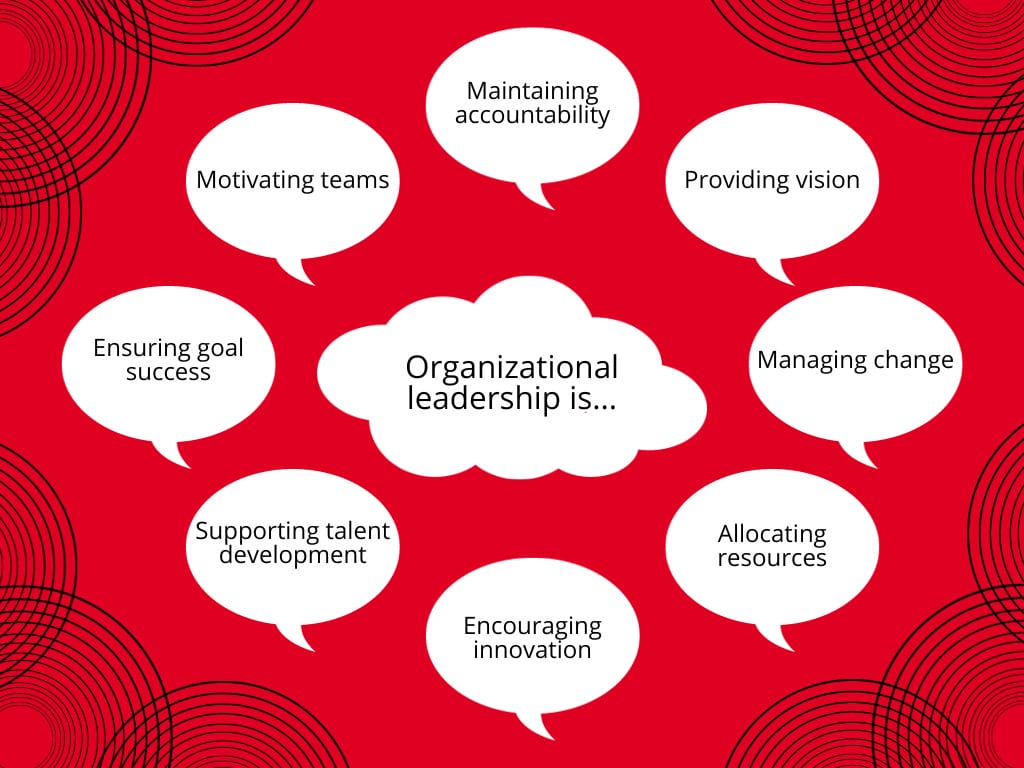 Organizational leadership is the practice of guiding and managing individuals and/or teams to implement strategic plans for an organization. It involves setting a vision, defining strategies, and making decisions to propel the organization forward. In other words, organizational leaders are expected to provide direction, inspire and motivate employees, and cultivate a positive work culture. Effective organizational leadership encompasses various leadership styles and ideas to fit a team’s unique needs, goals, and challenges. Successful leadership will positively shape culture, foster innovation, and ensure efficient business operations.