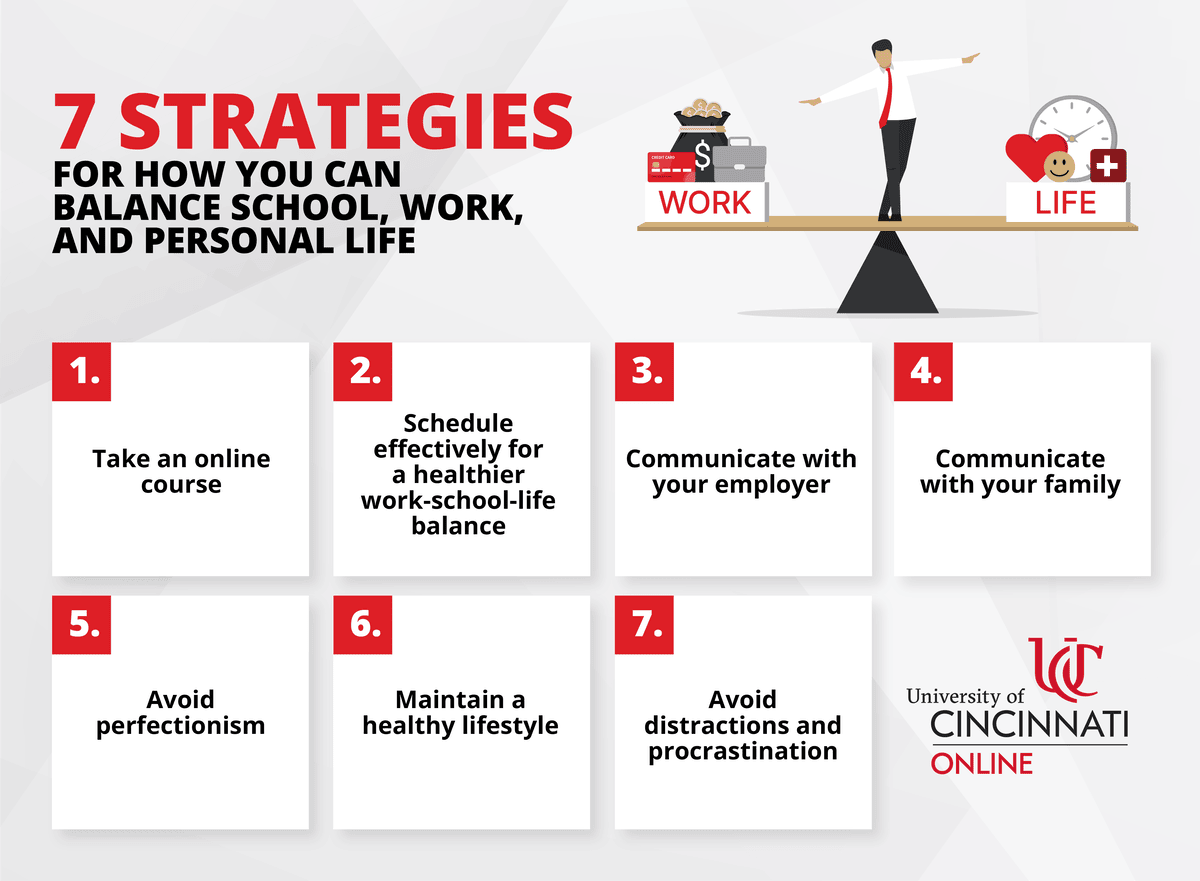 An unhealthy work-school life balance can leave you feeling overwhelmed and may even take a toll on your physical and mental health, too. Here are some ways to manage your time wisely and balance work, school, and personal commitments more easily: